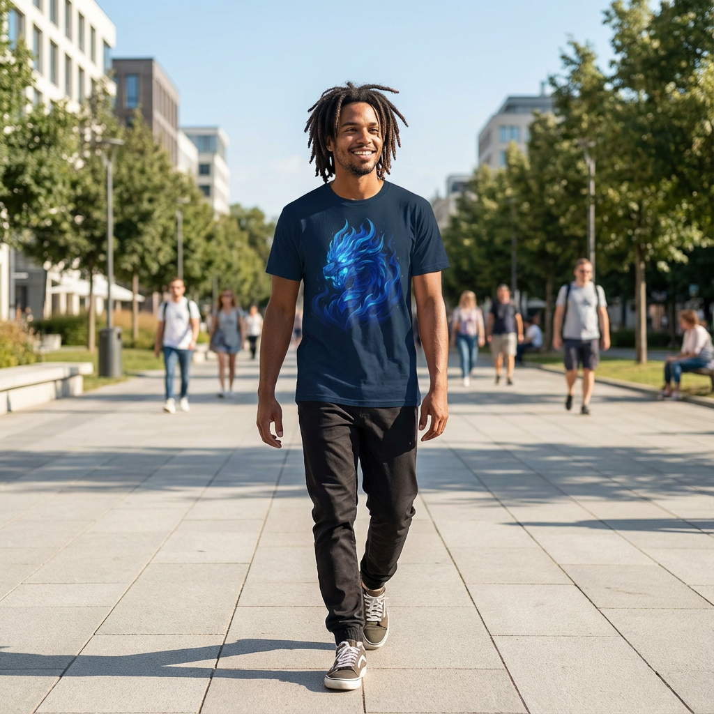 Dieses Heavy Cotton T-Shirt zeigt einen blauen Flammendrachen, geformt aus Energie und fließenden Flammen. Das Motiv steht für Stärke, Kontrolle und uralte Macht und ist Teil der Flamebound Dragons – Blue Flame Dominion Kollektion von Cinematic Horizons.